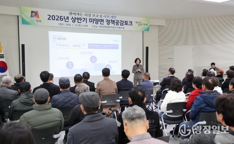 광장일보 주재영 기자 | 안성시 미양면은 지난 1월 15일, 미양면행정복지센터 대회의실에서 주민 120여 명이 참석한 가운데 ‘2026년 상반기 미양면 정책공감토크’를 성황리에 개최했다.