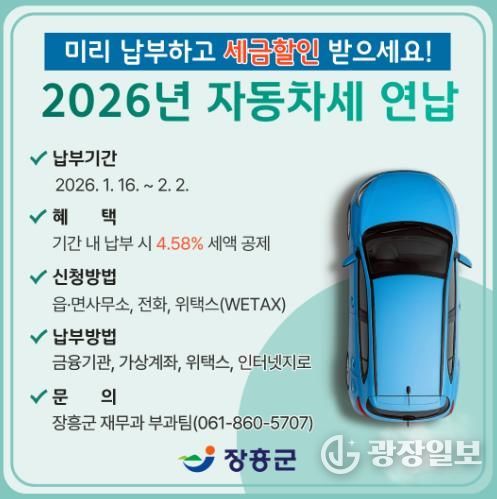 광장일보 주재영 기자 | 장흥군은 15일 2026년도 자동차세 연납 고지서를 장흥군에 등록된 모든 차량 소유자에게 일괄 발송했다고 밝혔다.