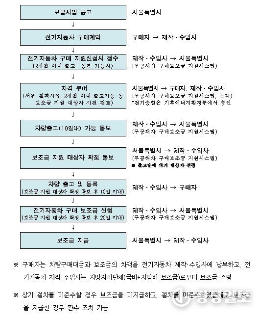 구매희망자는 자동차 제작·수입사와 계약을 체결하고, 제작·수입사가 서울시에 보조금을 신청하면 출고·등록 순으로 지원 대상자가 선정된다. 보조금은 차량 출고 및 등록 후 서울시가 제작·수입사에 직접 지급하며, 구매자는 보조금을 제외한 금액만 납부하면 된다.