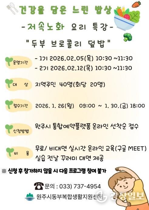 광장일보 이현나 기자 | 원주시 동부복합생활지원센터는 오는 26일부터 저속노화 요리 특강 ‘건강을 담은 느린 밥상’ 프로그램 참여자를 모집한다.