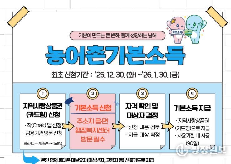남해군 관계자는 “농어촌 기본소득은 읍·면 행정복지센터 방문 신청이 원칙”이라며 “신청 기간 내 반드시 직접 방문해 신청 절차를 완료해야 최초 지급분을 받을 수 있다”고 말했다.