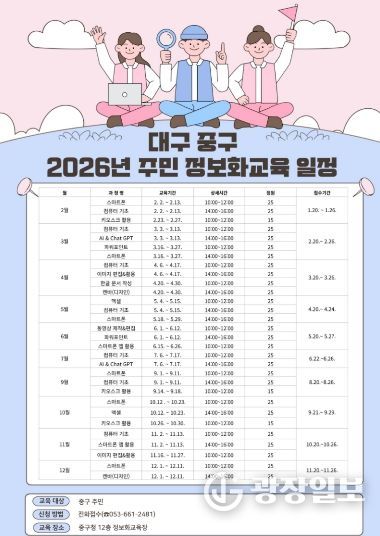 광장일보 주재영 기자 | 대구 중구는 주민의 디지털 활용 역량을 높이고 정보 격차를 해소하기 위해 오는 2월부터 구청 12층 정보화교육장에서 ‘주민 정보화교육’을 본격 운영한다.