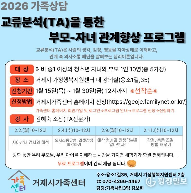 광장일보 주재영 기자 | 거제시가족센터는 오는 2일부터 진행하는'교류분석(TA)을 통한 부모–자녀 집단상담 프로그램' 참여자를 모집한다고 밝혔다.