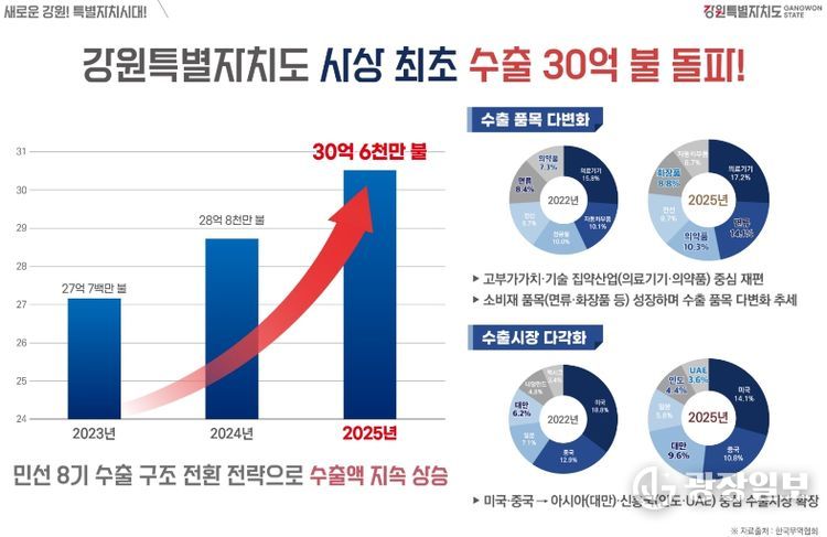 김진태 도지사는 “2025년도 수출액이 사상 처음으로 30억 불을 넘어섰다”며, “1980년대만 해도 대한민국 전체 수출 목표가 100억 불이었는데, 이제는 강원도만으로도 30억 불을 기록하게 됐다”고 말했다. 이어 “앞으로도 수출 품목과 수출시장의 다변화를 통해 강원수출의 성장기반을 탄탄히 다져나가겠다”고 밝혔다.