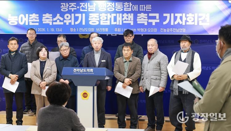 광장일보 주재영 기자 | 전라남도의회 박형대 의원(진보당·장흥1)은 1월 19일 도의회 브리핑룸에서 기자회견을 열고 “광주ㆍ전남 행정통합 논의가 속도를 내고 있지만 농어촌 축소 위기에 대한 대비는 현저히 부족하다”며 농어촌 보호를 위한 구체적 합의를 요구했다.
