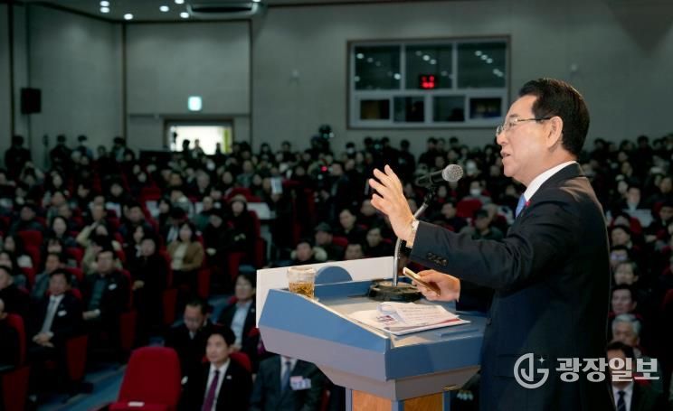 광주·전남 행정통합에 대한 뜨거운 관심과 열기로 500여 명이 넘는 도민이 참석해 발 디딜 틈 없이 대강당을 가득 메웠다.