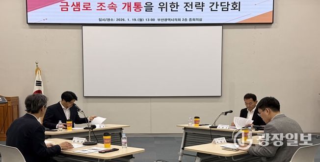 광장일보 주재영 기자 | 부산광역시의회 이준호.이종진 의원은 1월 19일 오후 1시, 시의회 중회의실에서 '금샘로 조속 개통을 위한 전략 간담회'를 개최했다. 이번 간담회는 산성터널 접속도로 미개설 구간인 금샘로 공사의 지연 원인을 점검하고, 조속한 사업 추진을 위한 실질적인 해결 방안을 모색하기 위해 마련됐다.