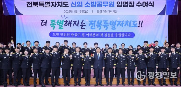 광장일보 주재영 기자 | 전북특별자치도는 19일 도청 4층 대회의실에서 2026년 신임 소방공무원 임명장 수여식을 열고, 도민의 생명과 안전을 지킬 신임 소방공무원 45명을 공식 임명했다.