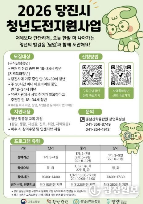광장일보 이현나 기자 | 당진시는 고용노동부가 주관하는‘청년도전지원사업’에 올해에도 선정돼 연중 참여자를 모집한다고 20일 밝혔다.