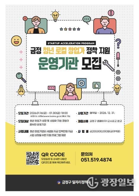 광장일보 주재영 기자 | 부산 금정구는 지역에 정착할 수 있는 청년 로컬 창업가를 육성하기 위해 ‘금정 청년 로컬 창업가 정착 지원’ 사업을 추진하고, 이를 운영할 운영기관(보조사업자)을 공개 모집한다고 밝혔다.
