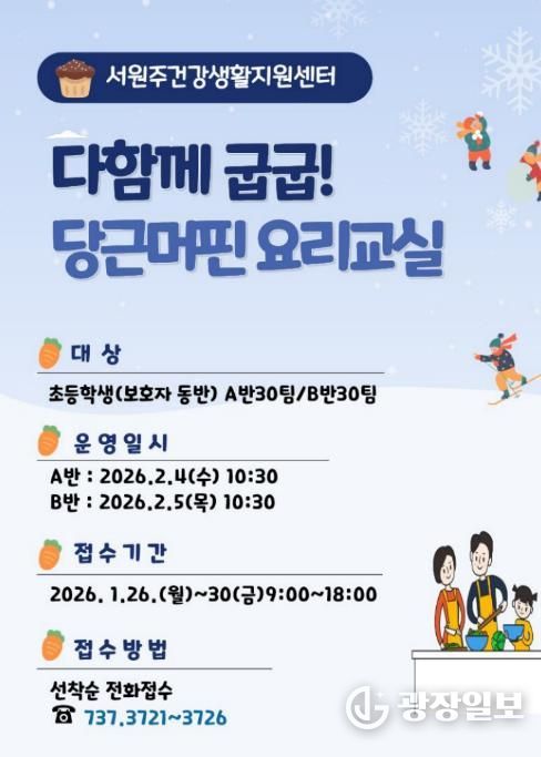 광장일보 이현나 기자 | 서원주건강생활지원센터는 겨울방학 중 아이들의 올바른 식습관 형성을 돕기 위해 ‘다함께 굽굽! 당근머핀 요리교실’ 프로그램을 운영한다.