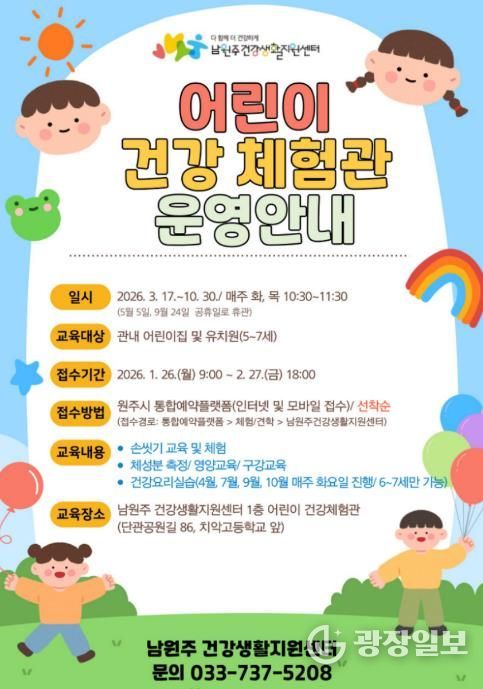 센터 관계자는 “어린이 건강체험관 프로그램이 유아기 건강 습관 형성에 길잡이가 되길 기대한다”라며, “관내 어린이집과 유치원의 많은 관심과 신청을 바란다”라고 말했다.