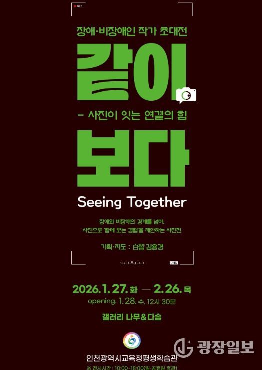 광장일보 주재영 기자 | 인천광역시교육청평생학습관은 인천 시민을 대상으로 2층 갤러리 나무와 다솜에서 ‘같이, 보다(Seeing Together) 장애인 작가 초대전’을 개최한다.
