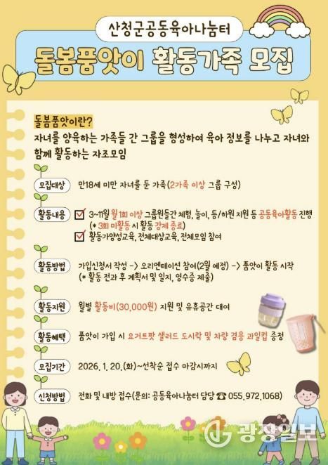 광장일보 주재영 기자 | 산청군가족센터는 20일 공동육아나눔터 운영 일환으로 돌봄품앗이 활동 가족을 모집한다고 밝혔다.