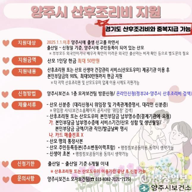광장일보 주재영 기자 | 양주시보건소가 2025년 1월 1일 출생아부터 관내 출산가정을 대상으로 ‘양주시 산후조리비 지원사업’을 시행하고 있다.