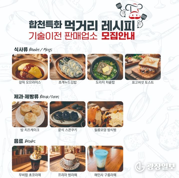 광장일보 주재영 기자 | 합천군은 지역 특산물을 활용한 차별화된 먹거리를 보급하고 관광객들에게 풍성한 미식 경험을 선사하기 위해 ‘합천특화 먹거리 레시피 기술이전 및 판매업소’를 2026년 1월 19일부터 2월 20일까지 모집한다고 밝혔다.