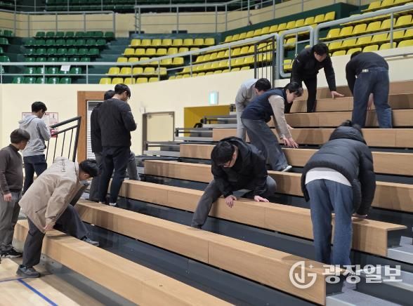 - 1부 시설 점검: 마루바닥의 평탄성 및 가변석 구동계 유격·고정 상태 정밀 확인