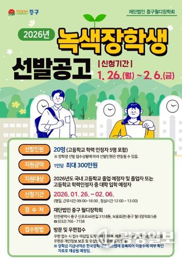 광장일보 주재영 기자 | 재단법인 인천 중구월디장학회(이사장 김정헌)는 지역 인재 육성을 위해 ‘2026년도 녹색 장학생’ 대상자를 모집한다고 20일 밝혔다.