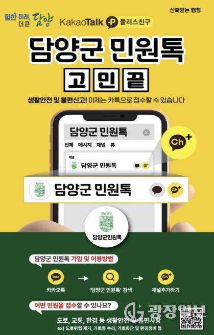 광장일보 주재영 기자 | 담양군이 군민과의 소통을 강화하고 생활 속 불편과 안전 문제를 신속하게 해결하기 위해 카카오톡 채널 ‘담양군 민원톡’ 활성화에 나섰다.