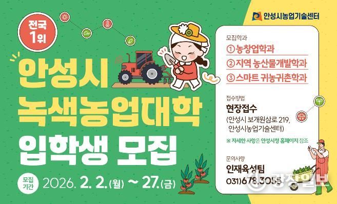 시 관계자는 “현장·창업·실무 중심 교육으로 안정적 영농 전문가를 양성한다”며 “관내 농업인들의 많은 참여를 부탁드린다”고 밝혔다. 안성시 녹색농업대학은 2025년 농촌진흥청 평가에서 전국 1위를 차지한 바 있다.