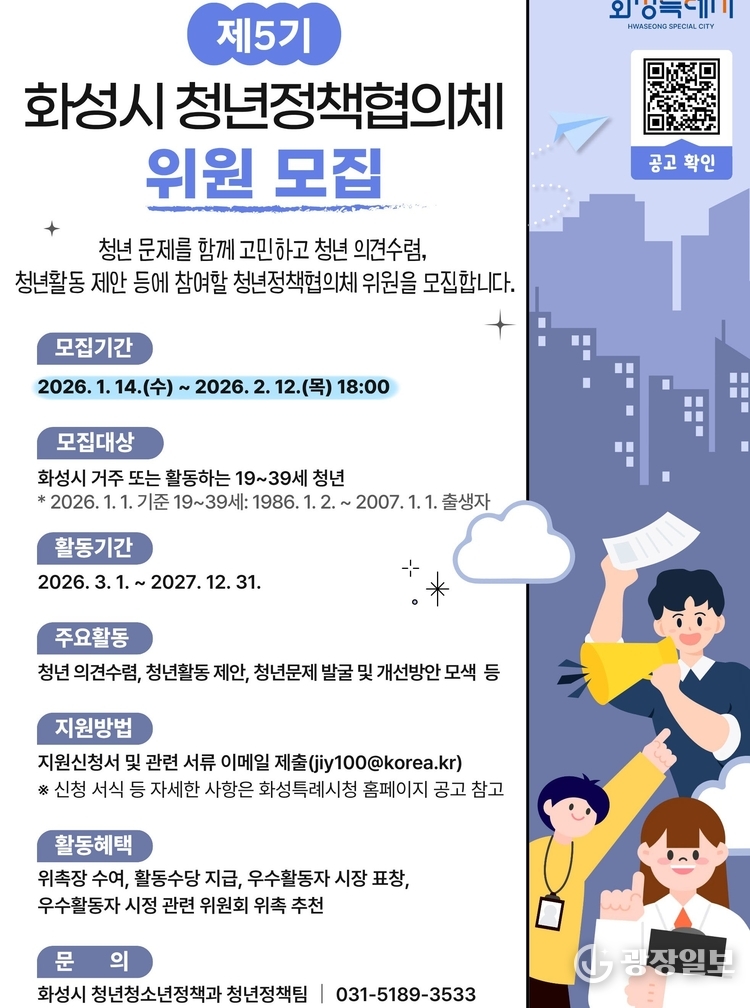 화성특례시=나병석 기자 | 화성특례시(시장 정명근)는 오는 3월 12일까지 ‘제5기 화성시 청년정책협의체 위원’을 모집한다고 19일 밝혔다.