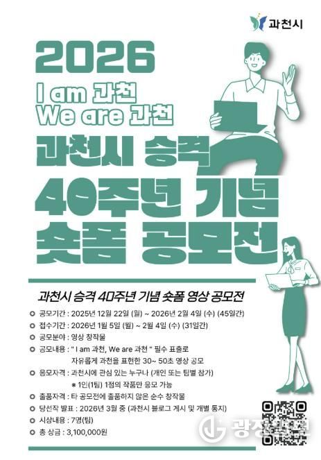 광장일보 주재영 기자 | 과천시는 시 승격 40주년을 맞아 ‘숏폼 영상 공모전’을 개최하고, 오는 2월 4일까지 작품을 모집한다고 밝혔다.