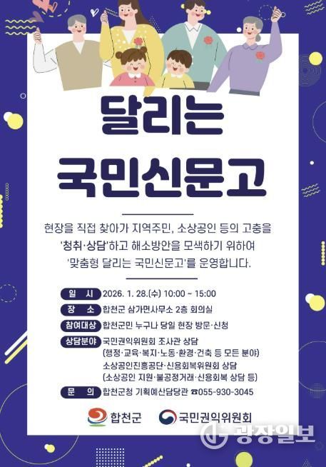 광장일보 주재영 기자 | 합천군은 2026년 1월 28일 오전 10시부터 오후 3시까지 삼가면사무소에서 국민권익위원회와 함께하는 ‘맞춤형 달리는 국민신문고’를 운영할 예정이다.