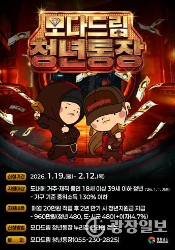광장일보 주재영 기자 | 경남 밀양시는 청년들의 자립 기반 조성과 지역 정착을 돕기 위한 ‘모다드림 청년통장’ 참여자를 오는 2월 12일까지 모집한다.