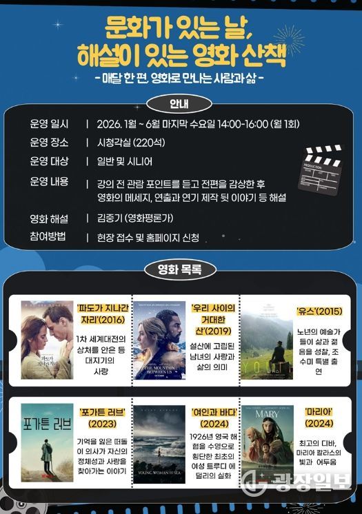 이번 프로그램은 2026년 1월부터 6월까지 문화체육관광부가 지정한 문화의 날인 매월 마지막 수요일 오후 2시부터 4시까지 일반 성인과 시니어를 대상으로 도서관 시청각실(220석)에서 진행하며 별도의 사전 신청 없이 현장 접수를 통해서도 참여할 수 있다.