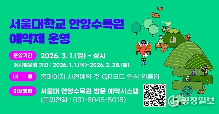 안양시청 =주재영 기자 | 58년 만에 시민에게 상시 개방된 서울대 안양수목원이 오는 3월 1일부터 사전예약제로 운영된다. 안양시는 방문객 증가에 따른 탐방객 분산과 식물자원 보호, 쾌적한 관람 환경 조성을 위해 예약제를 도입한다고 밝혔다.