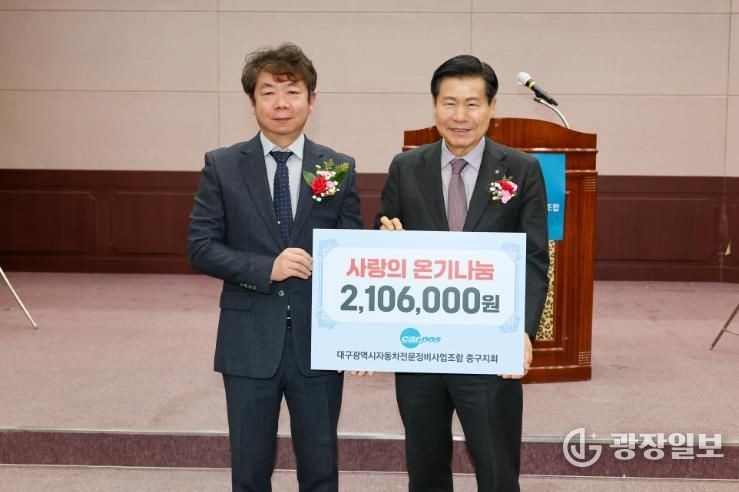광장일보 주재영 기자 | 자동차전문정비사업조합(카포스) 중구지회는 지난 21일 열린 카포스 중구지회 신년회에서 사랑의 온기나눔 성금 210만 6천 원을 대구 중구청에 기탁했다.