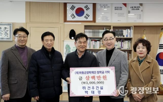 광장일보 주재영 기자 | 하동군장학재단은 지난 21일 ㈜건우건설 백태경 대표가 군수 집무실을 방문해 지역 인재 육성을 위한 장학기금 300만 원을 전달했다고 밝혔다.