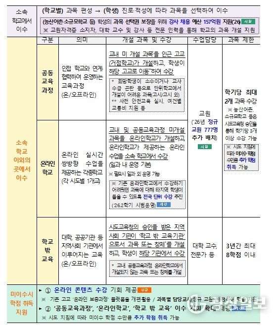 학생들이 다양한 선택 과목을 이수할 수 있도록 선택 과목의 개설 여건도 개선한다. 온라인학교와 공동교육과정 거점학교 등에 정규교원을 추가 배치(’26, 777명)하고, 농산어촌·소규모 학교(442교) 등에서도 다양한 과목을 개설할 수 있도록 강사 채용을 지원(’26 1학기~, 157억 원)한다. 온라인학교의 전국 단위 수강을 추진하고, 고교—대학 연계 학점 인정 과목을 통해 학생의 추가적인 학교 밖 교육 이수도 지원(’26.1학기~, 10개 시도, 20여 개 대학 참여 예정)한다. 단위학교에서 개설되지 않은 과목의 온라인학교, 공동교육과정 이수 노력은 학교생활기록부에 기록된 교육과정 편제표를 통해 대학이 확인할 수 있다.