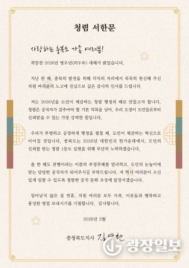 이어 “충북도는 2026년 대한민국 한가운데에서 도민의 신뢰를 받는 청렴 1등 도 실현을 위해 부단히 노력하겠다”며, 관행이라는 이름으로 이어져 온 부정부패를 멀리하고 도민의 눈높이에 맞는 당당한 공직자상을 확립해 줄 것을 당부했다.