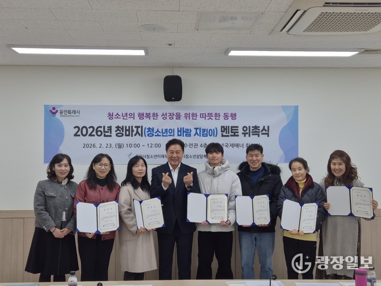 광장일보 =주재영 기자 | 용인시청소년미래재단(대표이사 김영우) 청소년상담복지센터는 2월 23일(월) 오전 10시 청소년수련관 4층 청소년국제매너 회의실에서 ‘2026년도 청바지(청소년의 바람 지킴이)’ 멘토 위촉식을 개최했다.