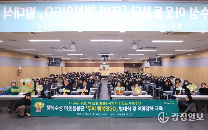 광장일보 주재영 기자 | 대구 수성구는 지난 25일 구청 대강당에서 지역사회 인적 안전망 강화를 위한 이웃돌봄단 ‘뚜비행복잇고(GO)’ 발대식을 개최하고 본격적인 활동에 나섰다.