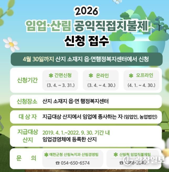 광장일보 주재영 기자 | 예천군은 임업인의 소득 안정과 산림의 공익기능 증진을 위해 4월 30일까지 ‘2026년 임업·산림 공익직접지불금’ 신청을 받는다.