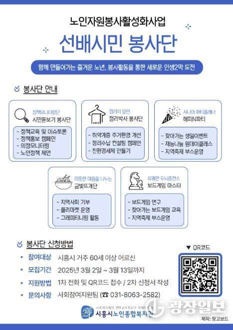 봉사단 인원은 총 10명을 선정할 계획으로, 모집 기간은 3월 13일까지다. 신청은 시흥시노인종합복지관 사회참여지원팀으로 전화하거나 홍보 포스터의 정보무늬(큐알코드)를 통해 하면 된다.