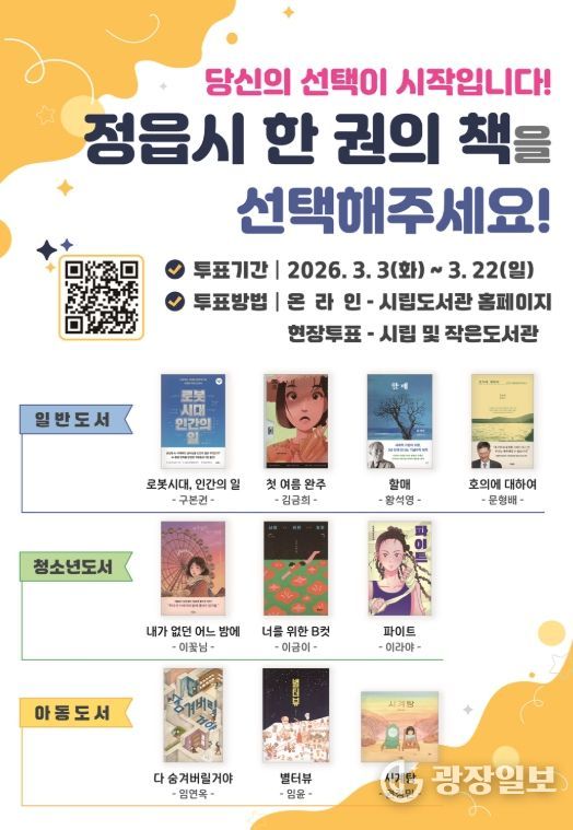 광장일보 주재영 기자 | 정읍시가 시민이 함께 읽고 공감하는 독서문화 확산을 위해 2026년 ‘한 권의 책’ 선정을 위한 시민 투표를 오는 22일까지 온·오프라인으로 실시한다.