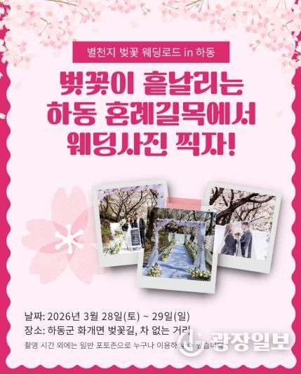 광장일보 주재영 기자 | 하동군은 오는 3월 27일부터 29일까지 열리는 ‘제27회 화개장터 벚꽃축제’를 앞두고, 특별한 웨딩 촬영 이벤트의 참가 신청을 받는다고 밝혔다.