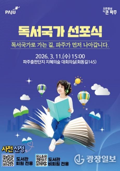 광장일보 주재영 기자 | 파주시는 오는 11일 15시, 파주출판도시 지혜의숲 대회의실에서 ‘파주시 독서국가 선포식’을 개최하고 책 읽는 도시를 넘어 ‘독서국가’로 나아가기 위한 힘찬 출발을 알린다.