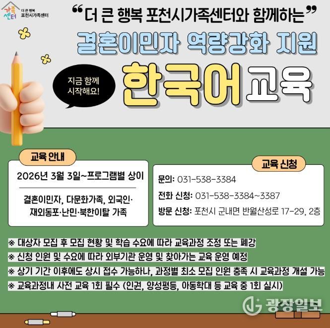 광장일보 주재영 기자 | 포천시 더 큰 행복 포천시가족센터는 2026년 결혼이민자 역량강화 지원 사업의 일환으로 한국어교육 과정을 수준별, 단계별 체계로 확대 개편하고 본격적인 운영에 들어갔다.