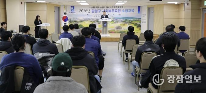 광장일보 박균현 기자 | 수원시 팔달구는 지난 5일 팔달구청 대회의실에서 사회복무요원 전원을 대상으로 2026년 상반기 소양교육을 실시했다.