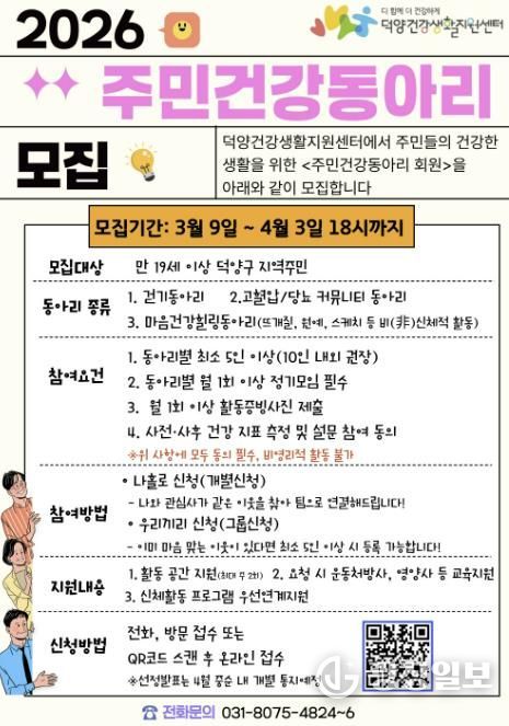 광장일보 주재영 기자 | 고양특례시 덕양건강생활지원센터가 지역주민이 주도하는 건강 행복 도시조성을 위해 ‘주민건강동아리’참여자를 모집한다.