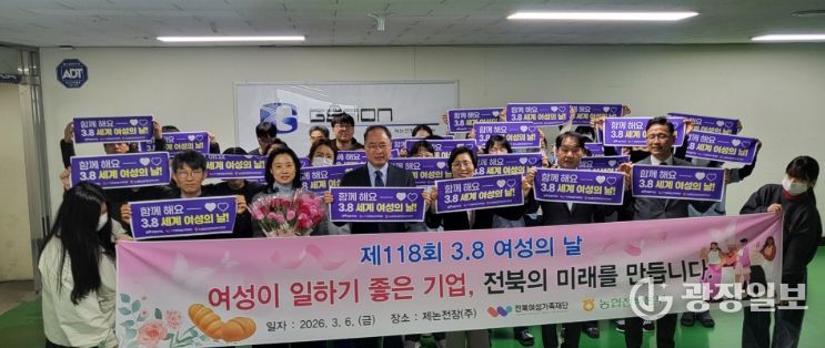 광장일보 주재영 기자 | 전북특별자치도는 6일 제118회 세계 여성의 날을 맞아 전북여성가족재단, 농협중앙회 전북본부와 함께 여성친화기업 제논전장㈜를 방문해 여성 근로자들을 격려하고 성평등 조직문화 확산을 위한 기념행사를 개최했다.