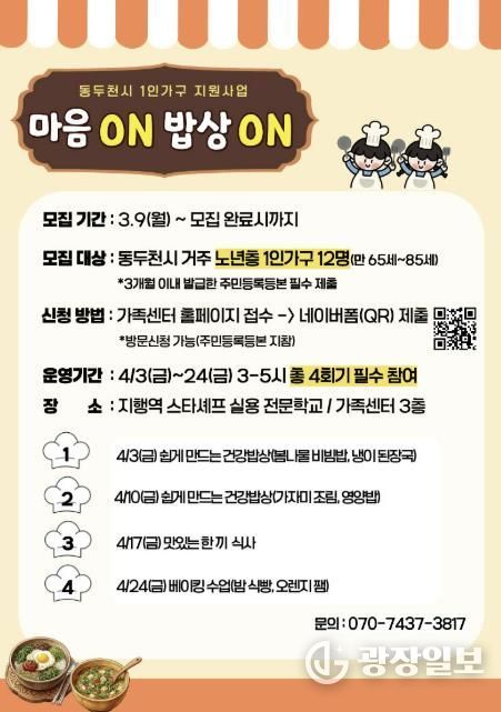 “1인 가구 식생활 개선 다이닝 – 마음 ON 밥상 ON”은 경기도와 동두천시의 지원을 받아 추진되는 2026년 동두천시 1인 가구 지원사업의 일환으로, 4월 노년층 프로그램을 시작으로 9월 중장년층, 10월 청년층 프로그램이 순차적으로 운영된다.