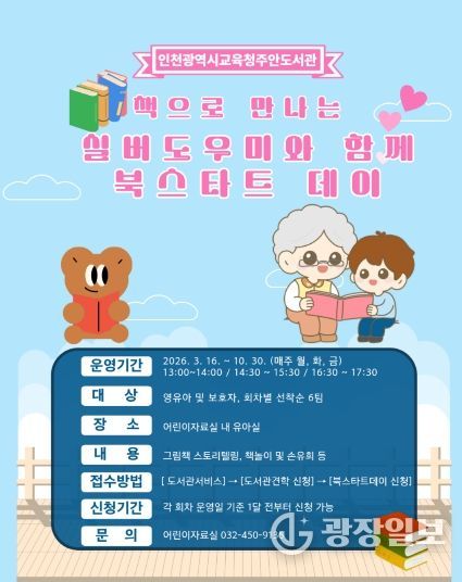 광장일보 주재영 기자 | 인천광역시교육청주안도서관은 오는 3월 16일부터 10월 30일까지 영유아 및 보호자를 대상으로 ‘책으로 만나는 실버도우미와 함께 북스타트 데이’를 운영한다.