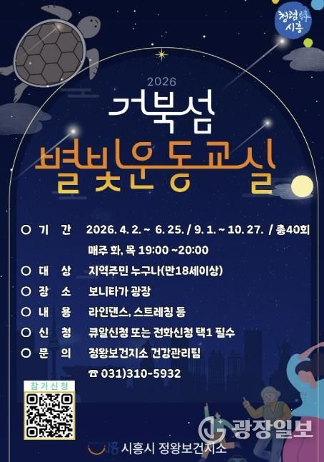광장일보 주재영 기자 | 시흥시는 지역주민의 신체활동 증진과 생활터 중심의 건강관리 지원을 위해 오는 4월 2일부터 거북섬동 보니타가 광장(MTV 3호광장)에서 ‘2026년 거북섬 별빛운동교실’을 운영한다.