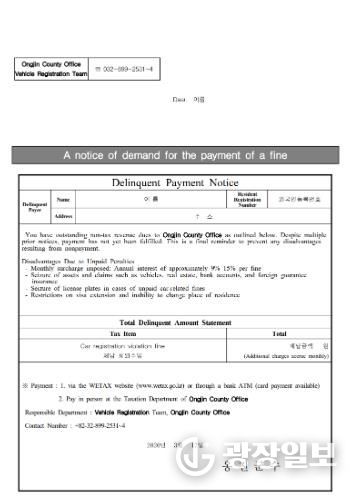광장일보 주재영 기자 | 옹진군이 자동차 과태료 외국인 체납자들을 대상으로, 영어로 번역된‘자동차 과태료 체납 안내문’을 발송한다고 밝혔다.