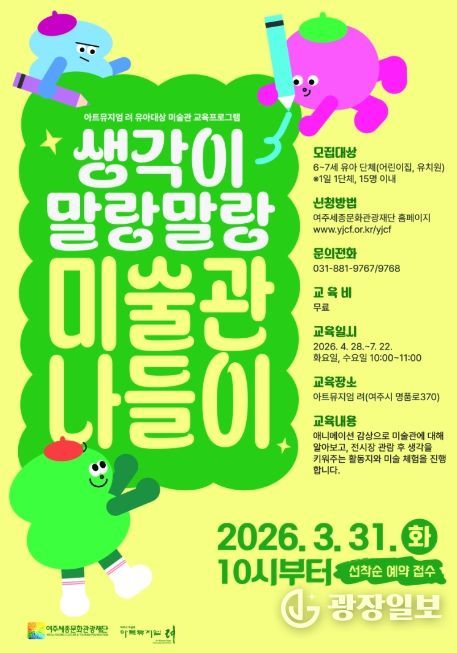 광장일보 주재영 기자 | 여주세종문화관광재단은 유아를 대상으로 하는 미술관 교육프로그램 '생각이 말랑말랑, 미술관 나들이'를 오는 4월부터 10월까지 아트뮤지엄 려에서 운영한다고 밝혔다.
